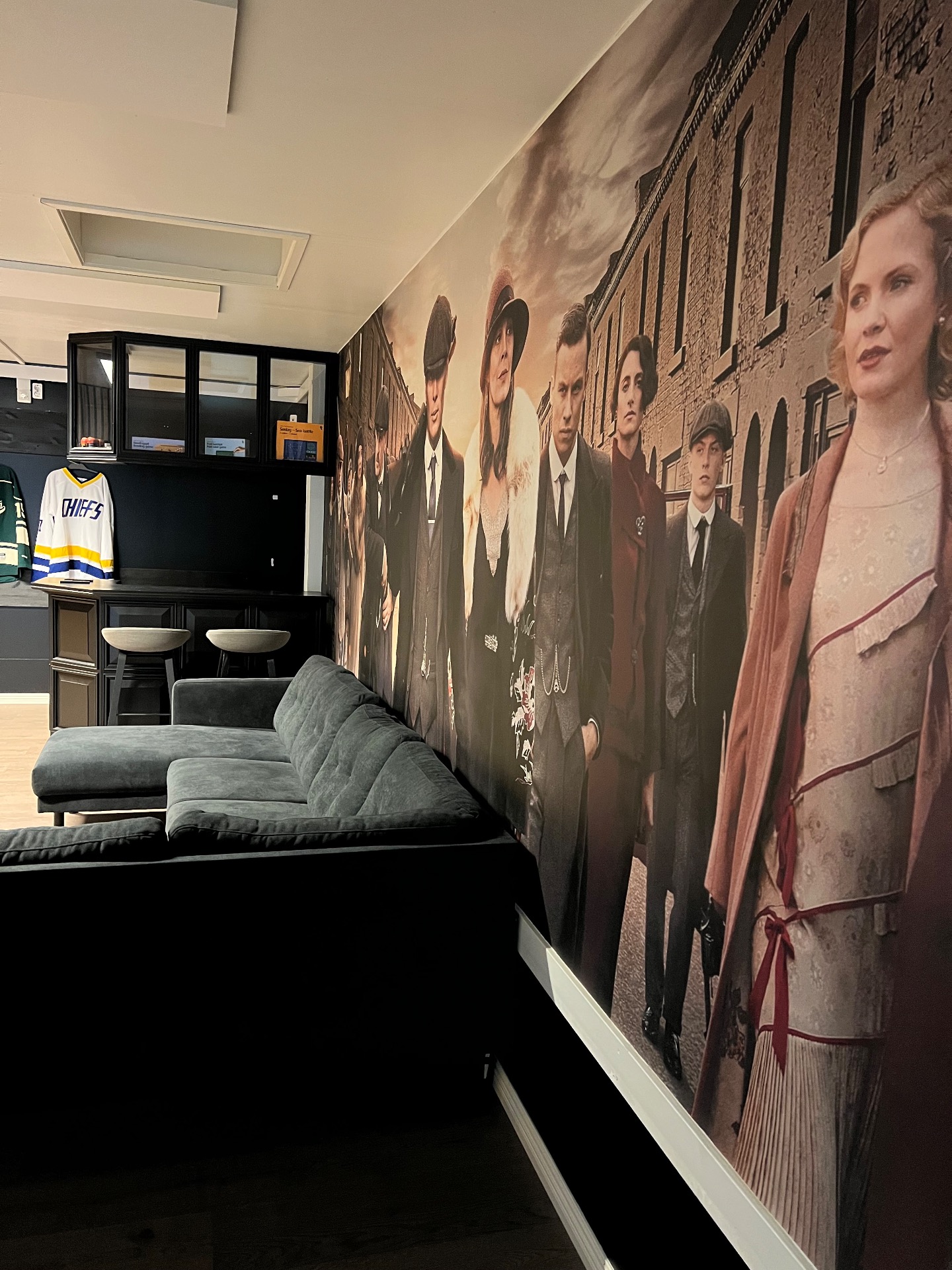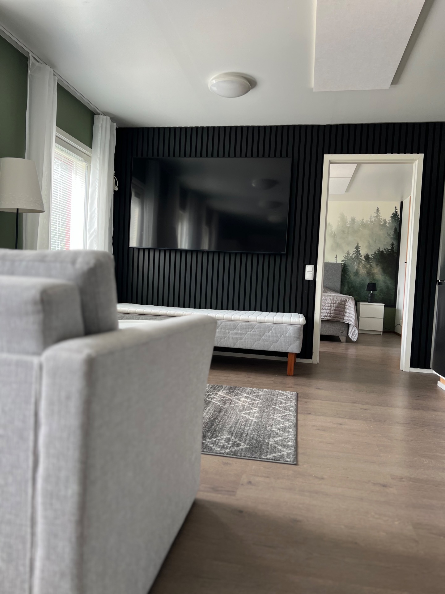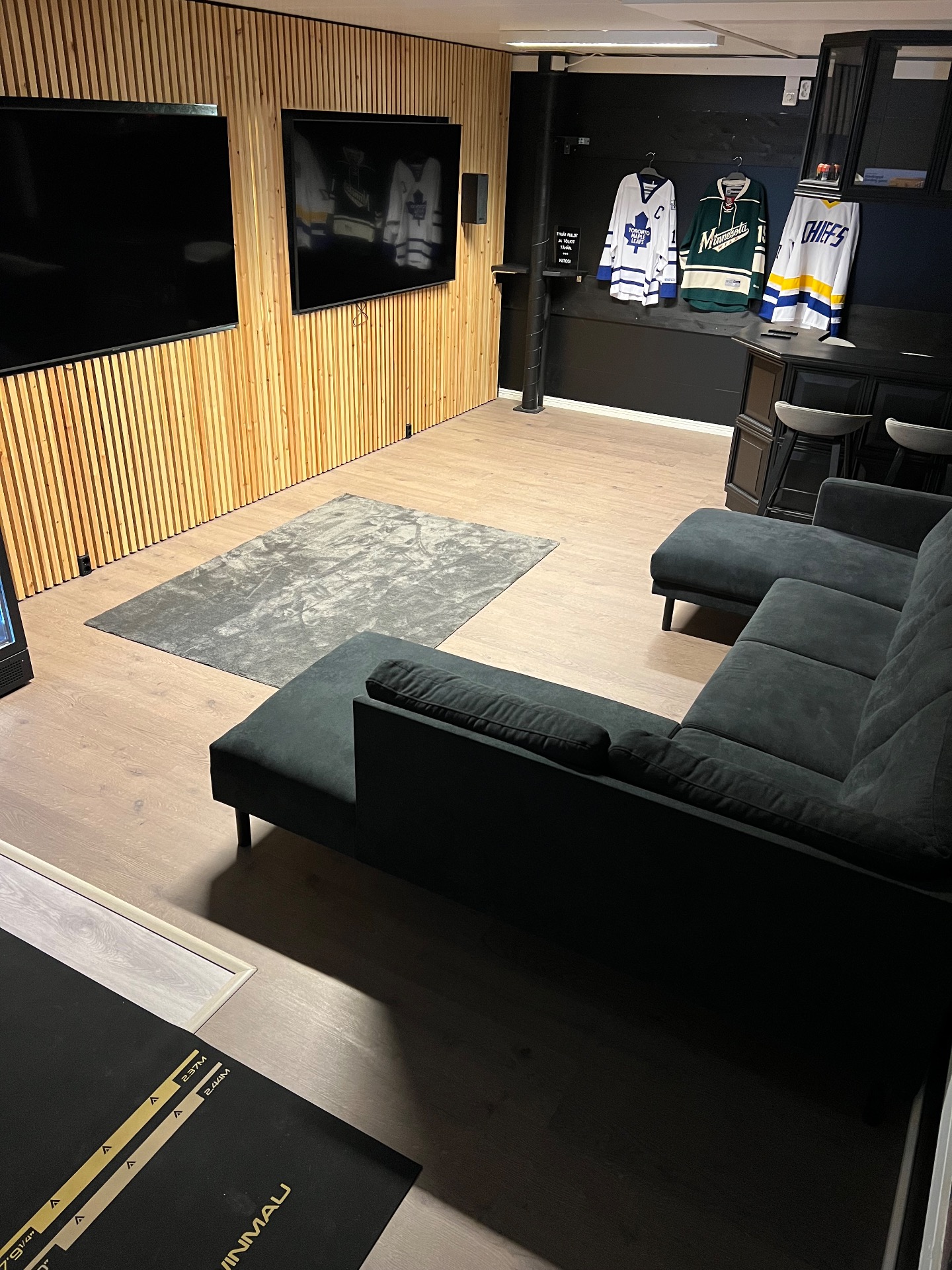 Baarin puolella iso sohva, juomakaappi, DARTS, 2x75” Televisiot ja baarinurkkaus.